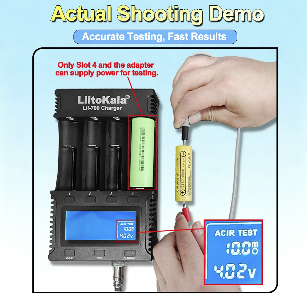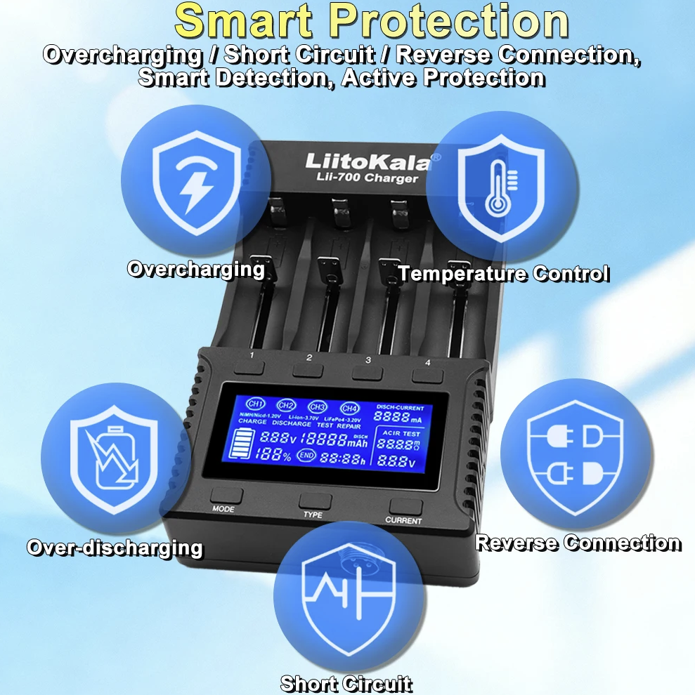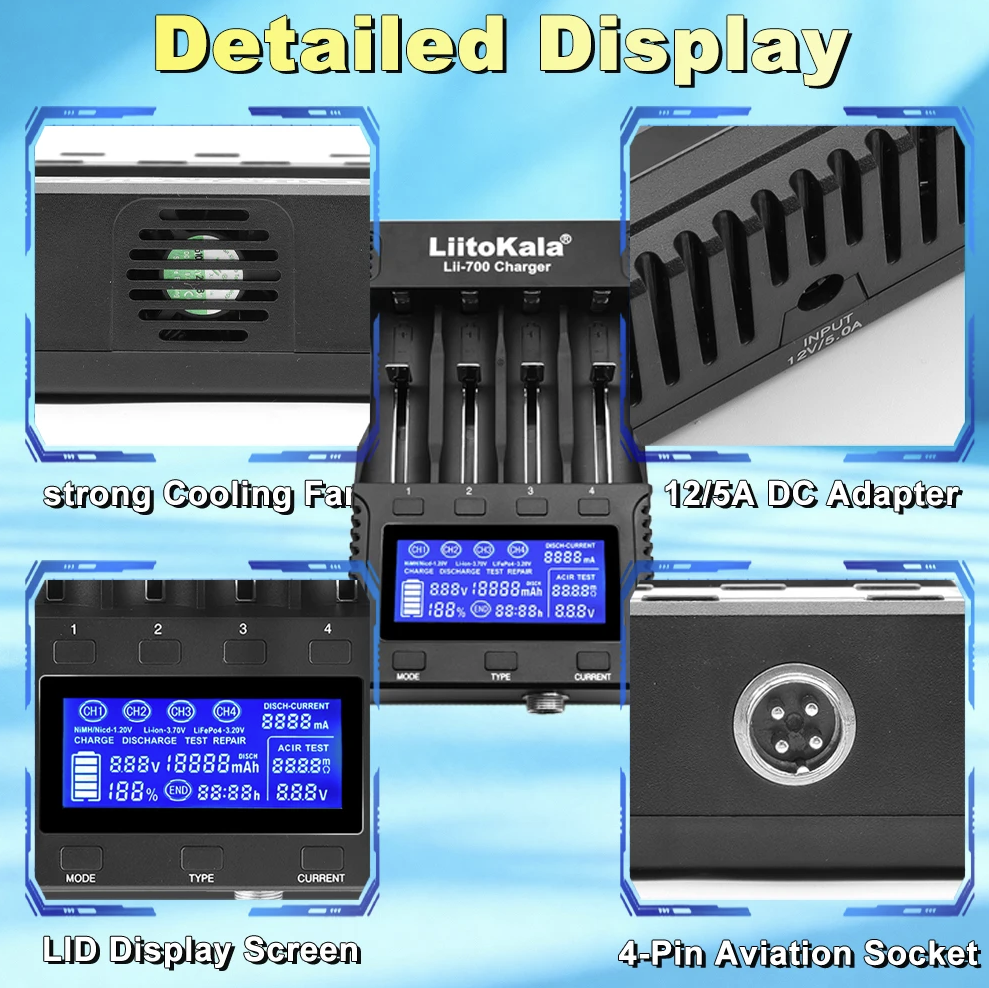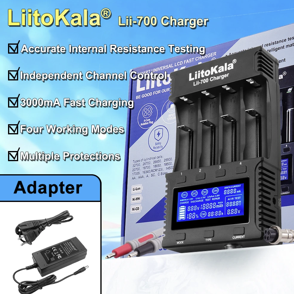 Lii-700 4-Channel Smart Charger with Independent Charging, Internal Resistance Testing, Capacity Detection, and Repair Mode with 12V 5A Adapter. Compatible with Li-Ion/Ni-MH/LiFePO4 batteries: 32700, 26700, 26650, 25500, 18650, 21700, 26650, 14500 AA and AAA. Ideal for high-power flashlights, power tools, digital cameras, instruments, etc.