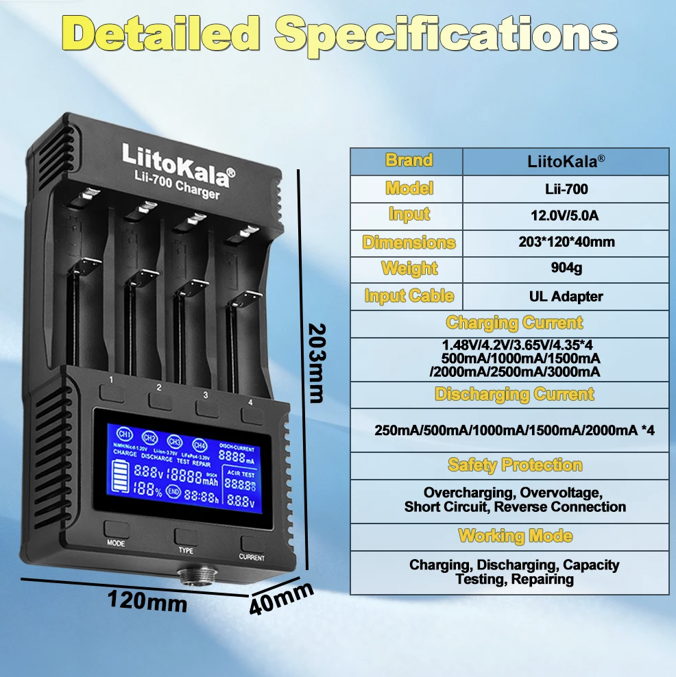 The Lii-700 is widely used to charge batteries for high-intensity flashlights, power tools, instruments, digital cameras, and other electronic devices. Thanks to its attractive appearance, safe and convenient operation, portability, and powerful functions, it's an excellent tool for the home.